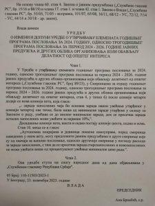 Uredba o izmeni i dupuni Uredbe o utvrđivanju elemenata godišnjeg Programa poslovanja za 2024...